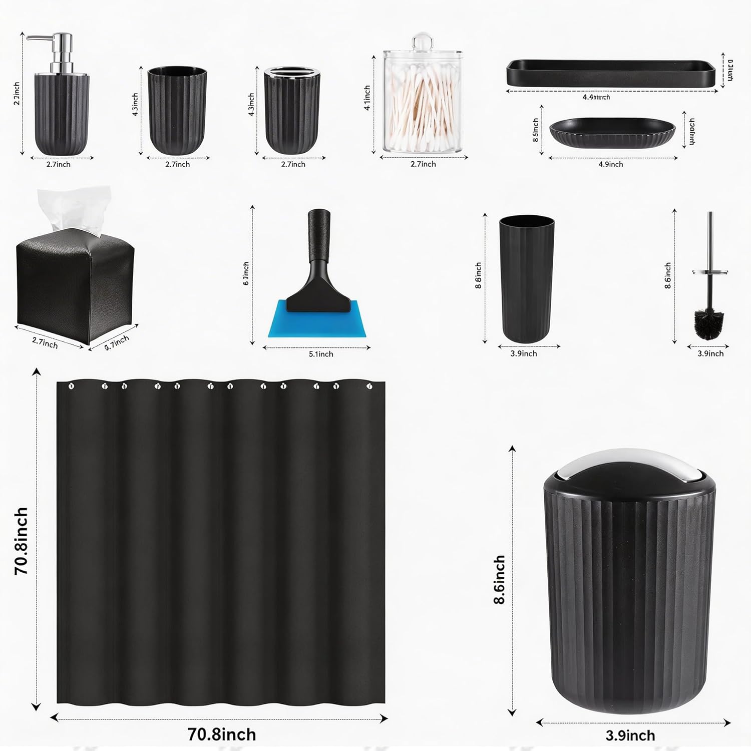 Bathroom Accessories Set, 11PCS Black Bathroom Accessory Set with Shower Curtain, Trash Can, Soap Dispenser, Soap Dish, Toilet Brush, Toothbrush Holder and Cup, Q-tip Holders, Tissue Box, Squeegee
