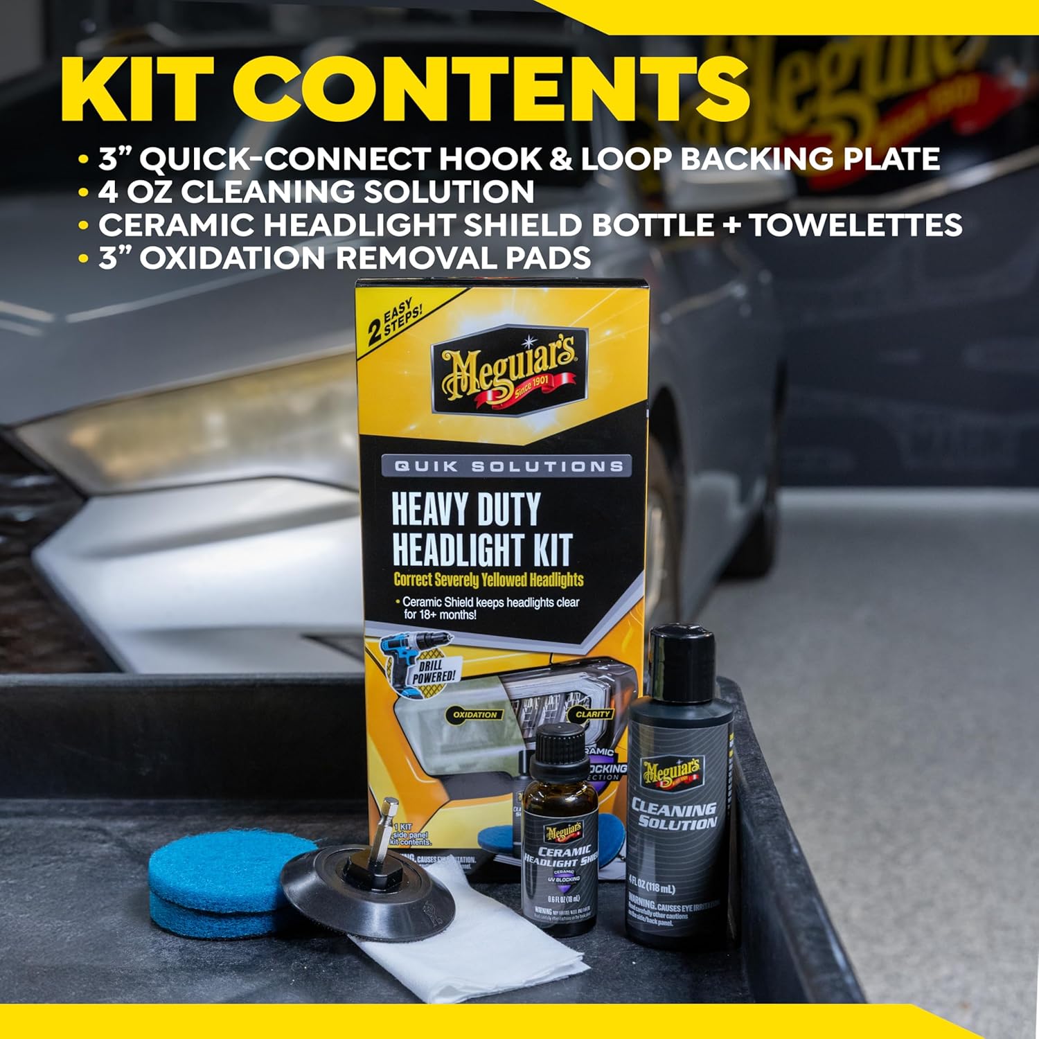 If your plastic headlights look unclear, what can you do? Replacing headlights can be expensive, and they may be difficult to source depending on the make, model, and age of the vehicle. A quality headlight kit makes a real difference. Meguiar's Quik Solutions Heavy Duty Headlight Kit removes oxidation, cloudiness, and yellowing, delivering a crystal-clear finish to restore your headlights. This premium car headlight restoration kit gives you everything needed for professional results. In this kit, you get 2 Oxidation Removal Pads, a 3 backing plate, a bottle of Cleaning Solution, a bottle of Ceramic Headlight Shield protectant, and 4 towelettes for application. Attach the removal pads and cleaning solution to your drill and let it do the heavy lifting. After removing yellowing and cloudiness, complete the process with ceramic-based protection. Apply it by hand using one of the included towelettes, and you're done. Enjoy restored headlights and keep them cleaner for 18 plus months! Meguiar’s Headlight Restoration Kit makes restoring headlight clarity and keeping that clarity a painless process. Meguiar's family of Quik Solutions kits provides everything needed, including a drill-based quick-connect accessory. These kits make it easy to quickly address the most common challenges users face when caring for their vehicles. Choose our Leather Care Kit, All Weather Floor Mat Kit, Carpet & Cloth Cleaning Kit, and Scratch Eraser Kit for easy cleaning solutions.