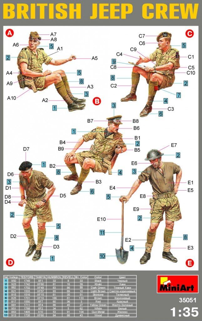 From the Manufacturer This highly detailed Miniart 1/35 scale British Jeep Crew plastic model kit accurately recreates a WWII British Jeep Crew including 5 figures with various uniforms in varied positions. Fine details including maps and driving goggles, helmets, hats. Typical WWII British crew wearing short pant and having different ranks.