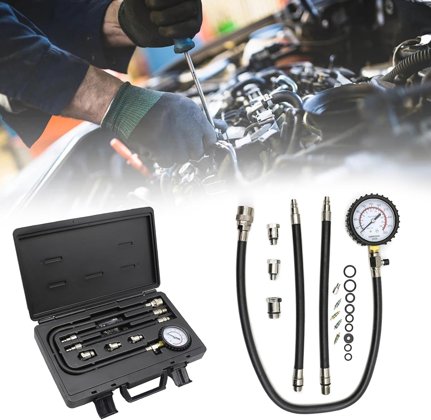 Features: This gasolines engine compression test set is suitable for various types of gasolines engines, including domestic, imported, and small engines, to meet the testing needs of different vehicles. The set is equipped with 12inch 14mm standard and long telescopic hoses, as well as 10mm, 12mm, and 18mm threaded adapters, ensuring compatibility with various engines and enhancing flexibility of use. Equipped with a double scale 2-1/2inch diameter gauges, capable of measuring pressures up to 300pounds per square inches and 2100kilopascals, combined with frame and outer protective cover, ensuring precisions and durability. The tester adopts a corrosions-resistant coating surfaces treatments, greatly improving the durability of the product, suitable for long-term use, and reducing the risk of frequent replacement due to damage. The product packaging is equipped with a storage box, which facilitates the safe storage of all components, protects tool from damage, and is easy to carry and store. Specifications: Component:ABS,Metal Hose Length:12'' Gauges diameter: 2-1/2inches Note: Please allow 1mm errors due to manual measurement. Due to the differences between different monitors, the picture may not reflect the actual color. Package includes: 1Set Compression Tester