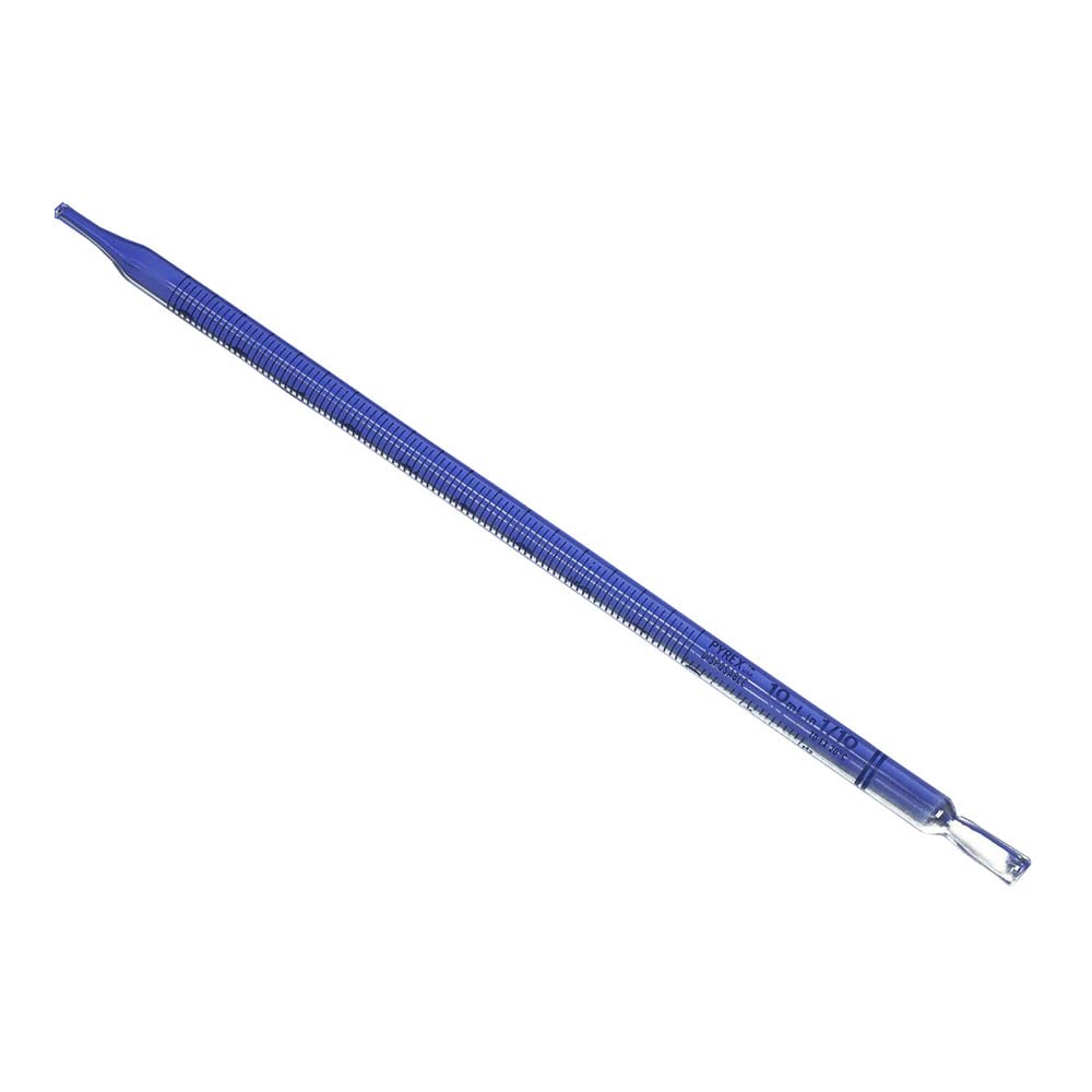 These sterile disposable 10mL PYREX serological pipets are designed for the larger-volume user. They are calibrated "to deliver" (TD) with blow-out and are packed to permit easy access to several pipets at a time without contaminating the entire case. Similar to No. 7077, except multi-packed in plastic bags. New I.S.O. color-coding is printed directly on the tear strip for easy identification by size. Reference: ASTM E-714.