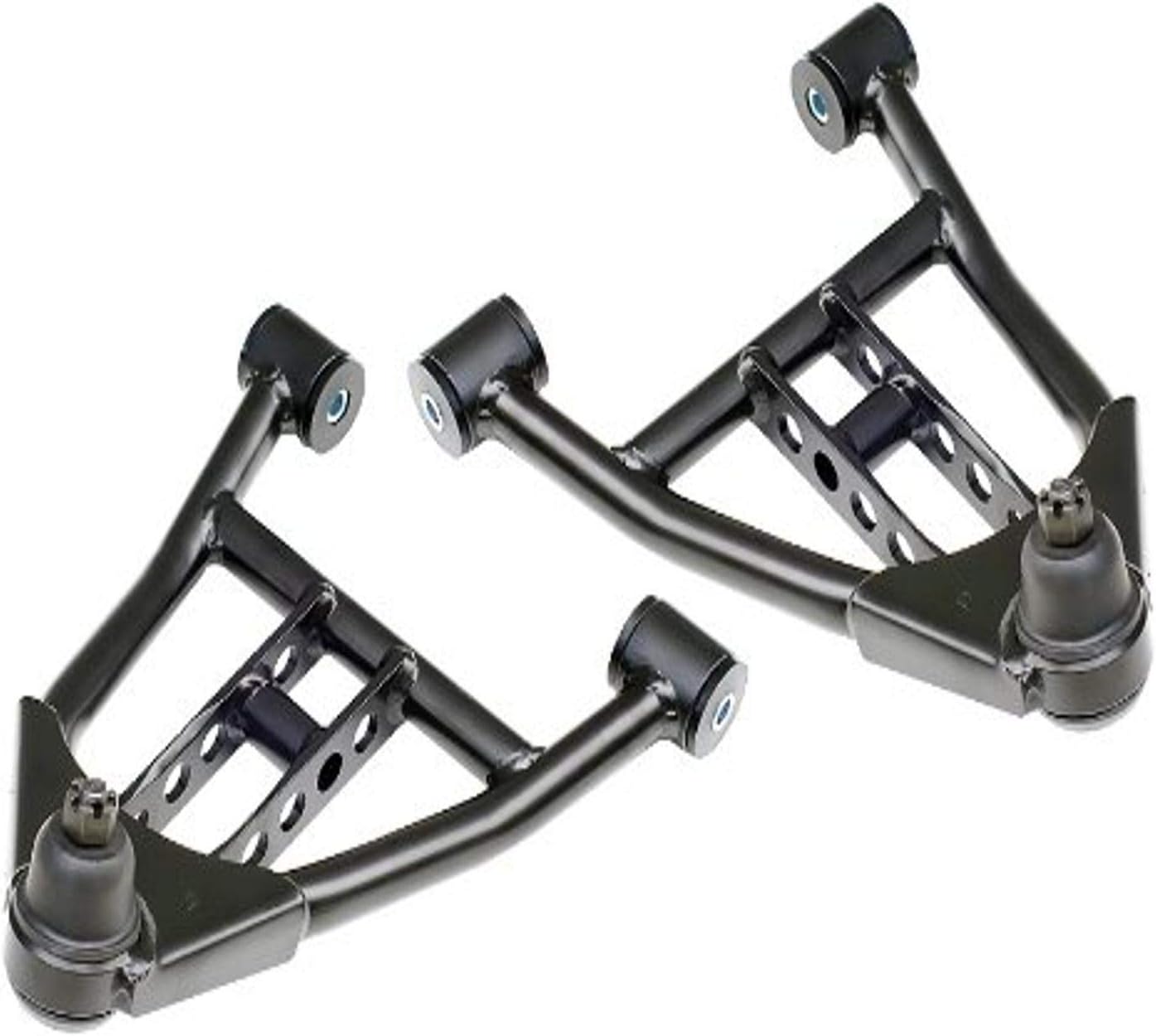 Front lower StrongArms for 1964-1972 fits GM A-Body. For use with Coil-Over/Shockwave. Includes a pair of tubular control arms with ball joints and made with Delrin bushings. Powder coated satin black.