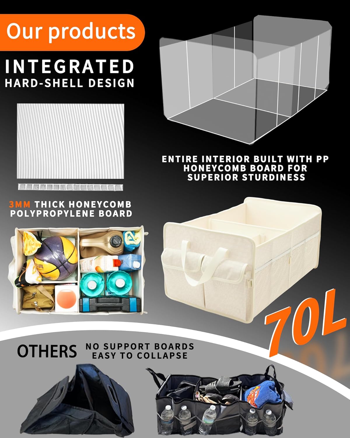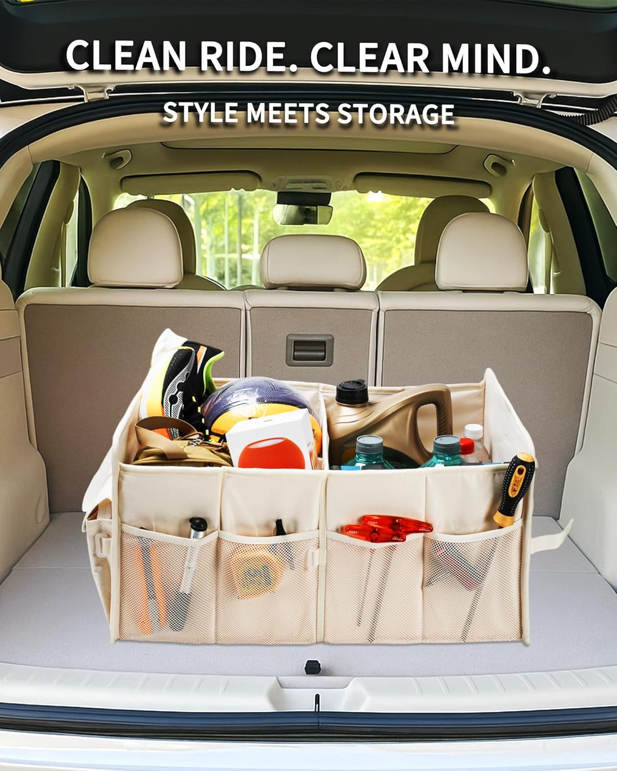Our car trunk organizer offers spacious storage, measuring 23.6" L x 15.7" W x 12.6" H when fully expanded. Featuring 2 large front and rear pockets, 4 side mesh pockets, 1 large compartment, and 2 removable Velcro dividers, it accommodates your daily storage and organization needs with ease. Crafted from superior 290T twill fabric with a stylish black leopard print pattern, our truck bed organizer combines elegance with durability. Thickened, high-stiffness dividers along its four sides and bottom ensure it maintains its shape and stands upright, even under heavy loads. Additionally, its easy-to-clean design allows for complete immersion in water for thorough washing. Our car storage organizer boasts a foldable design for convenience. It can be easily opened, folded to half its length, or collapsed completely, integrating all components into one unit. Compatible with various car models, including SUVs, sedans, trucks, jeeps, minivans, vans, and more, it effectively eliminates trunk clutter. Rest assured with our confident purchase guarantee, offering a full refund or replacement service within 180 days and a 12-month warranty for any quality issues. We're committed to providing excellent service, and we'll respond promptly within 24 hours to address any questions or concerns you may have.